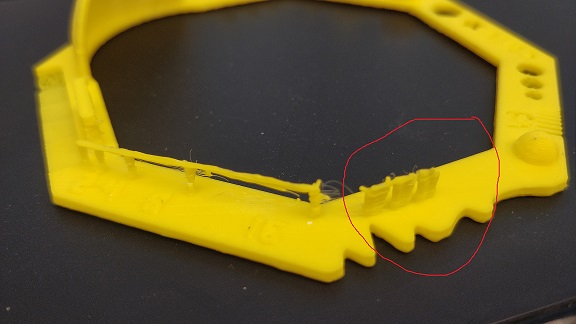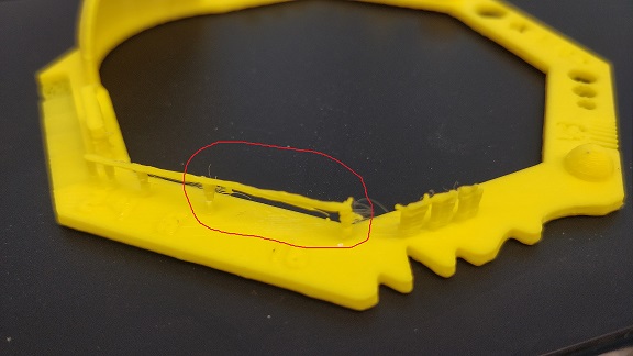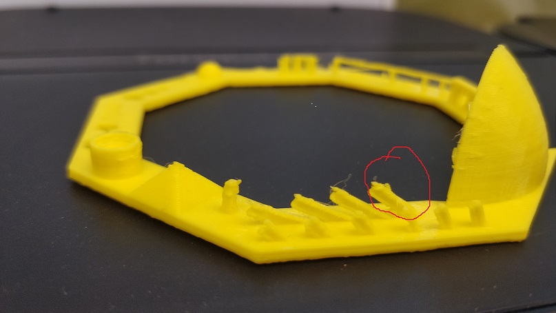 This parameter was tested for various angles i.e. 25, 30, 35, 40, 45, 50, 55, 60, 65, 70°. The result for 45 degree was not satisfactory as the deposition of PLA was not done properly in the section as shown in the image below-