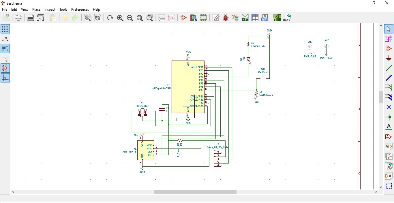 First, I have designed the circuit of the Hello World Board in KiCAD. In the schematics window, add all the components that will need for the hello world board.