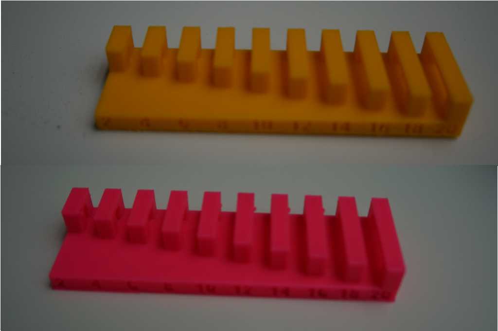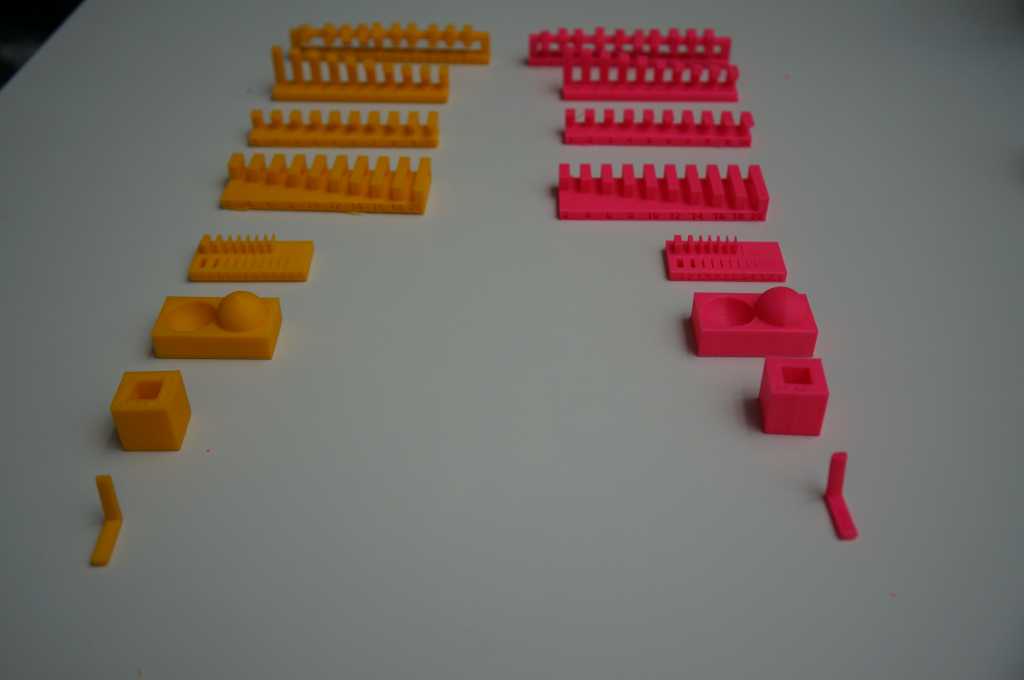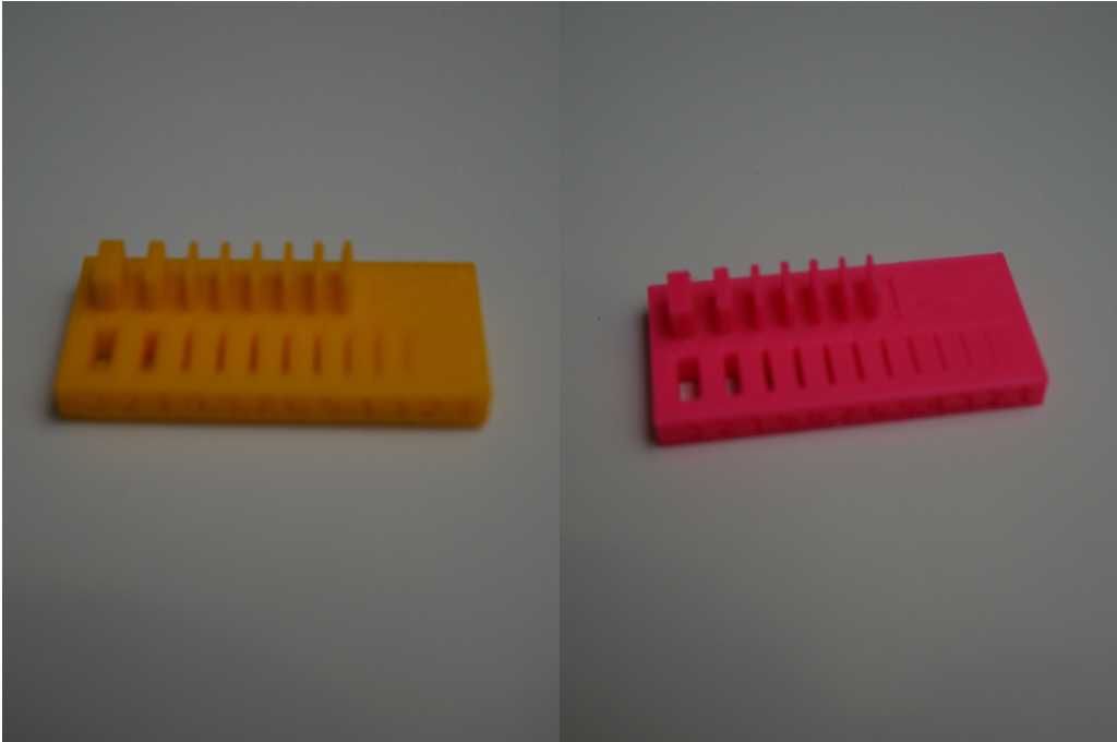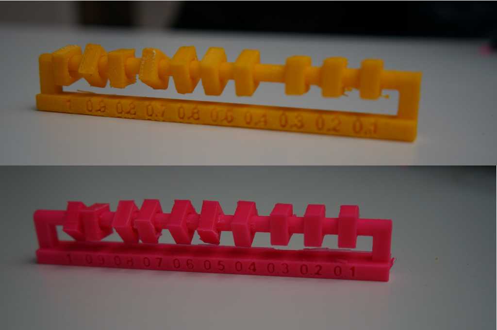 The clearance model was finished by each printer, but the pink (ABS) prints' first three elements (from the left) are easy moveable. On the yellow (PLA) print, the first six elements were moveable.