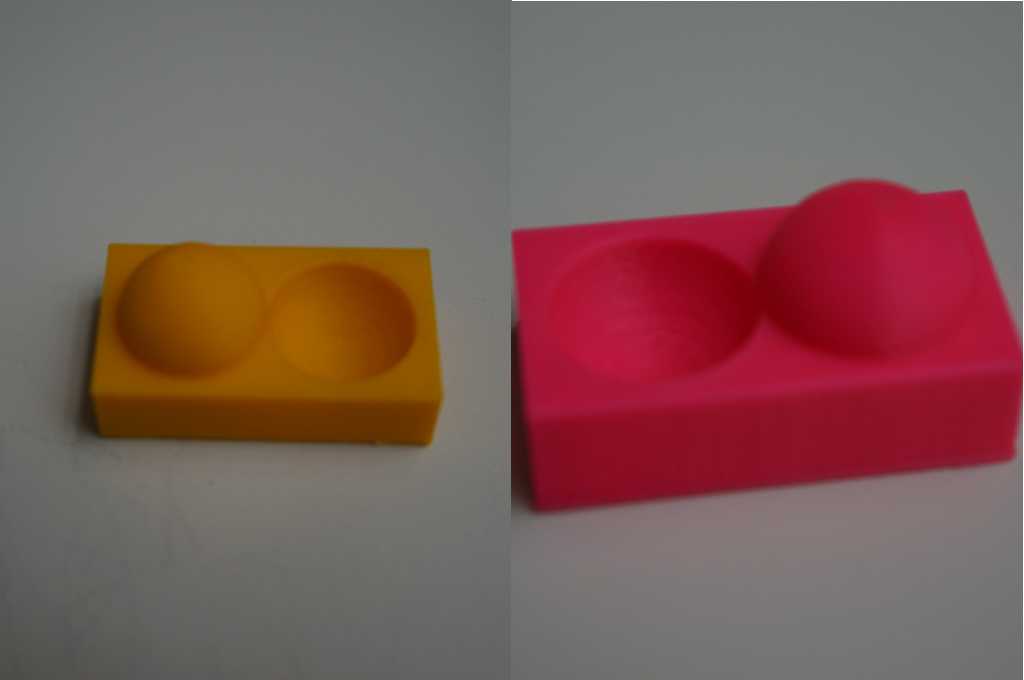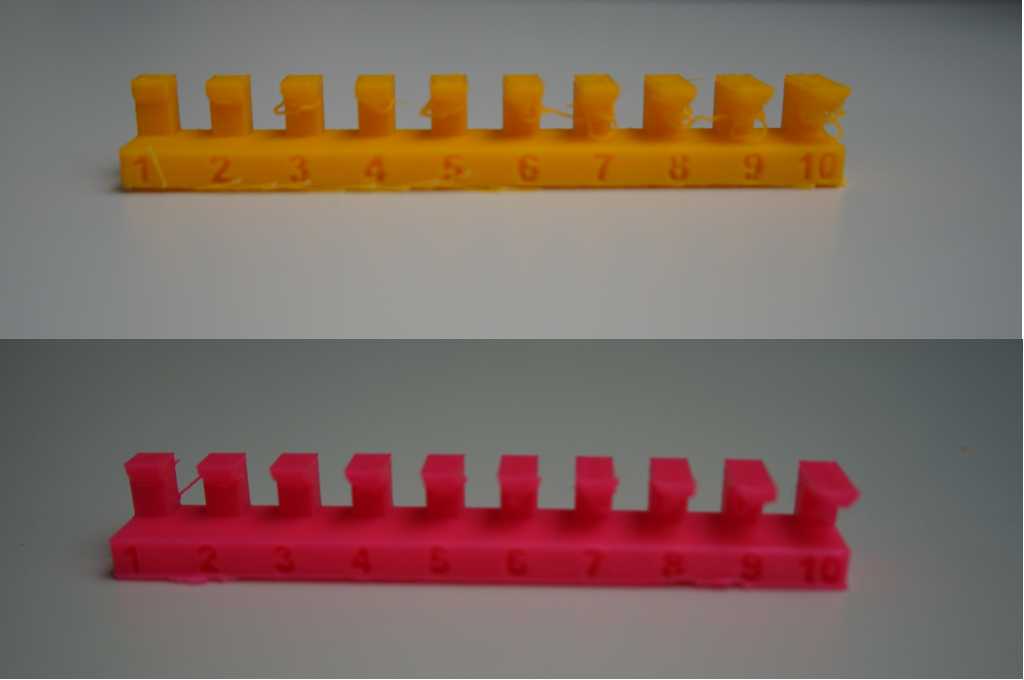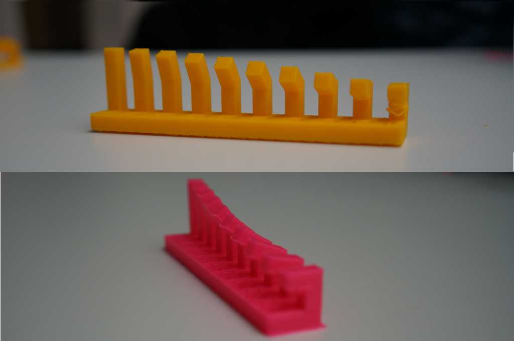 Both printers completed the angle model quite well, but the pink (ABS) print had problems with angles below 30 degrees. The yellow (PLA) print had the same problem, but with the 90° angle. The problems were the same as before with the overhang model. The bottom side got quite fuzzy.