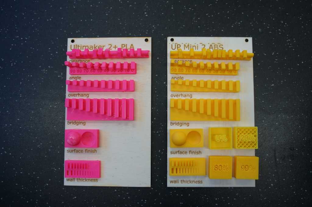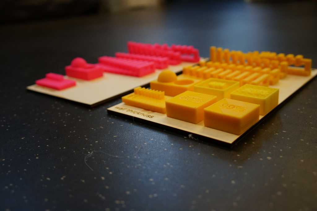 The yellow (ABS) were printed with the UP mini 2, the pink (PLA) prints were printed with the Ultimaker 2+.