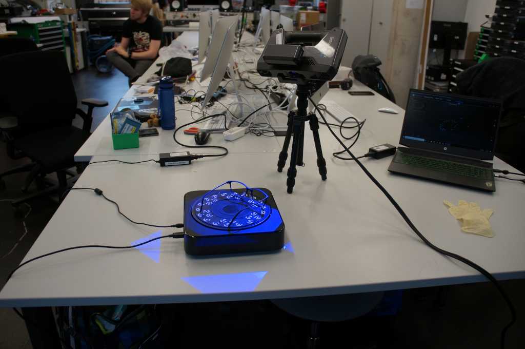 Here you can see my structure to scan. the scanner stands on a stand and is connected to the computer with an usb-cable. The object to be scanned lies on a platform which is also connected to the computer.