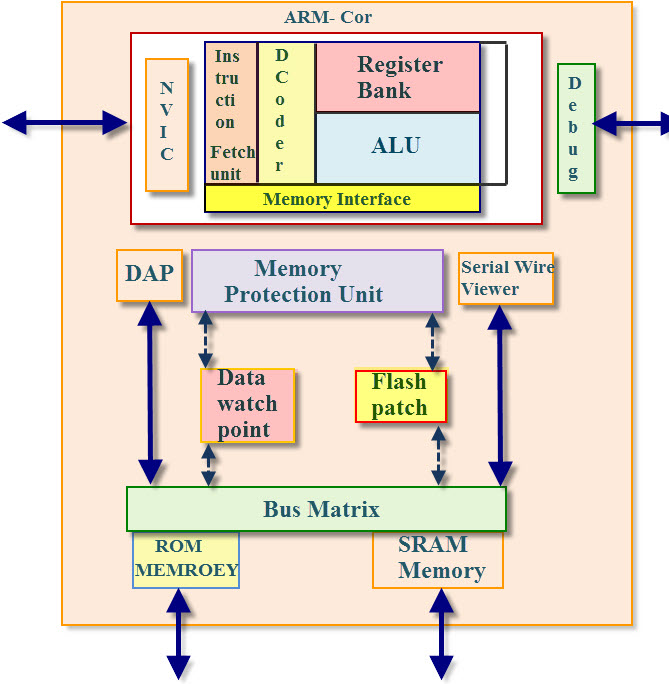 The ARM Coretex-M3 Mikrocontroller is a 32-Bit-processor, which provides separate data and command busses for communication with the ROM and RAM memory.
