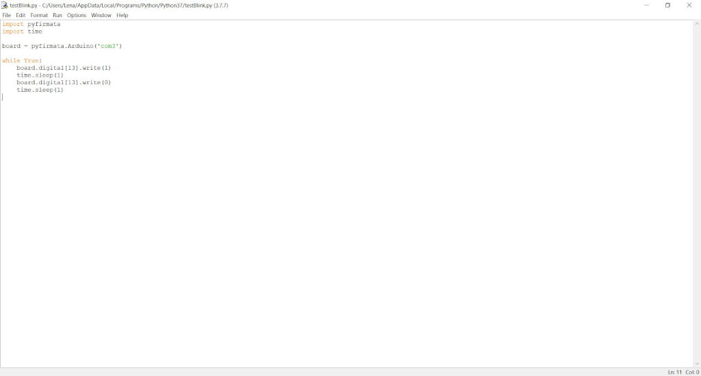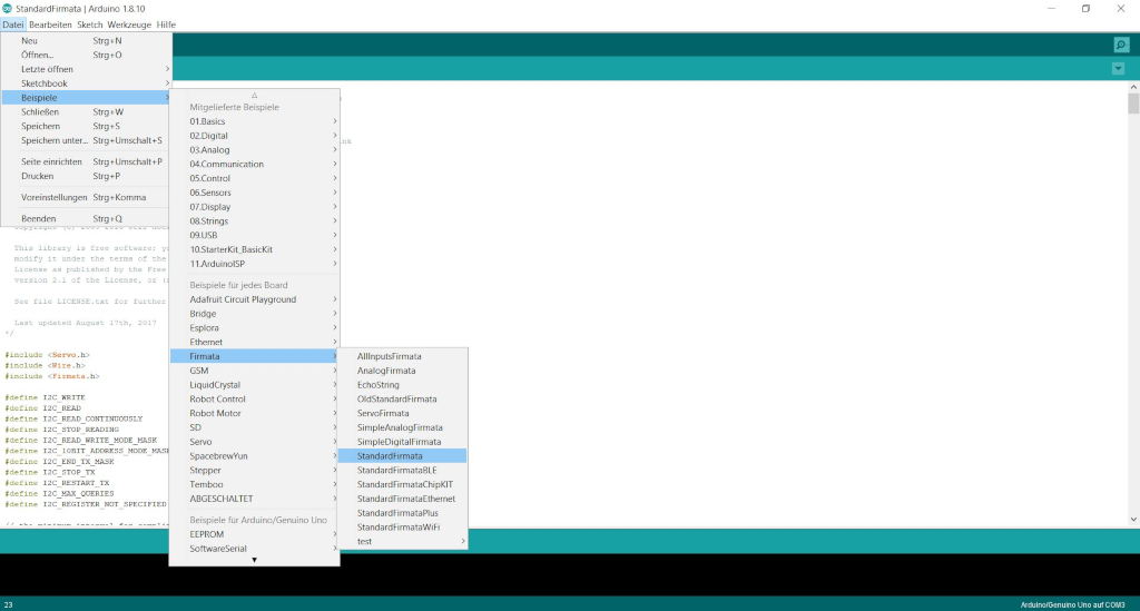 Before we can start programming in python we have to load the Firmata sketch sketch on the arduino. You can find it under File > Examples > Firmata > FirmataStandard.