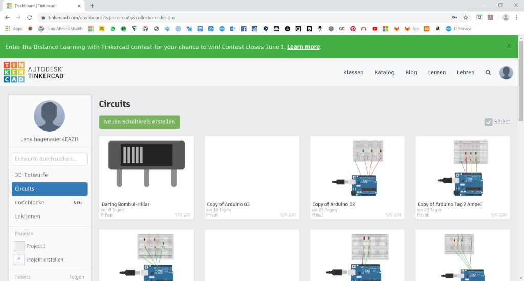 Later they had the opportunity to build and test control panels. For this we select circuits in the left menu. To start a new sketch we click on new sketch.