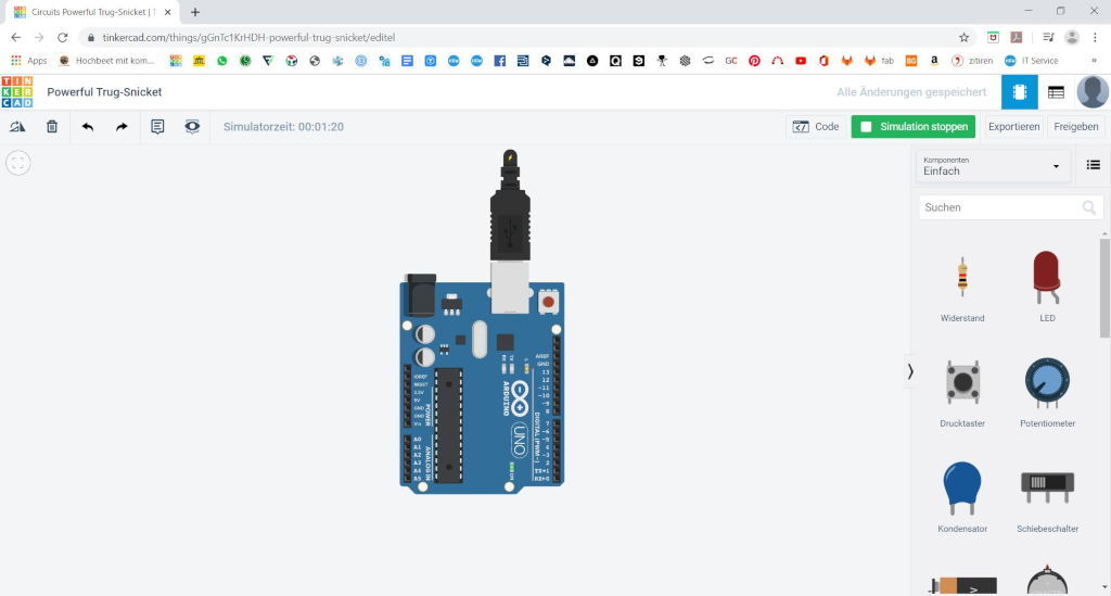 Now we come into a new menu in the middle is user building platform where we can build our electronic components together. On the right side we have a selection of electronic components which we can use. First of all we only need one Arduino. But it has many other possibilities and actuators and sensors.