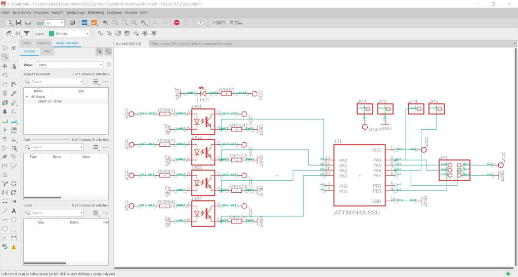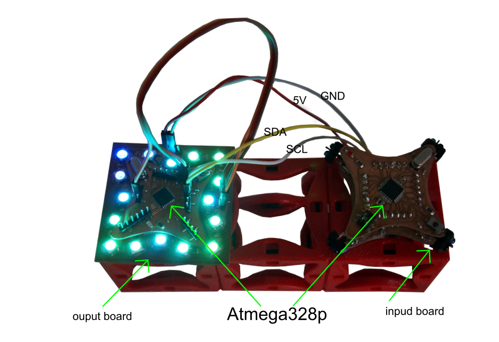 Since I am a one person group I will let communicate between my projects via i2c. I will use the Imput and thei output divice for in and output. As boards I will use the microcontroller from week 6 and the board I designed as the first prototype for the final. You can see the construction in the picture below.