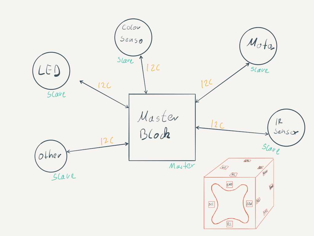 Now how can I best integrate this into my robot system. It would be practical to have a main block with a brain and different sensor and actuator blocks. These can then simply be plugged together using the existing magnet system, which can also be used to transfer data from the I2C bus. Then the master can see what is connected and use these blocks with sensors and actuators.