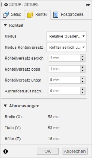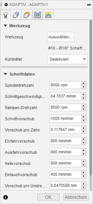 Thereupon a fixed one opens again. First of all, the milling cutter is adjusted here. Then the spindle speed and feed rate must be set for the corresponding material.