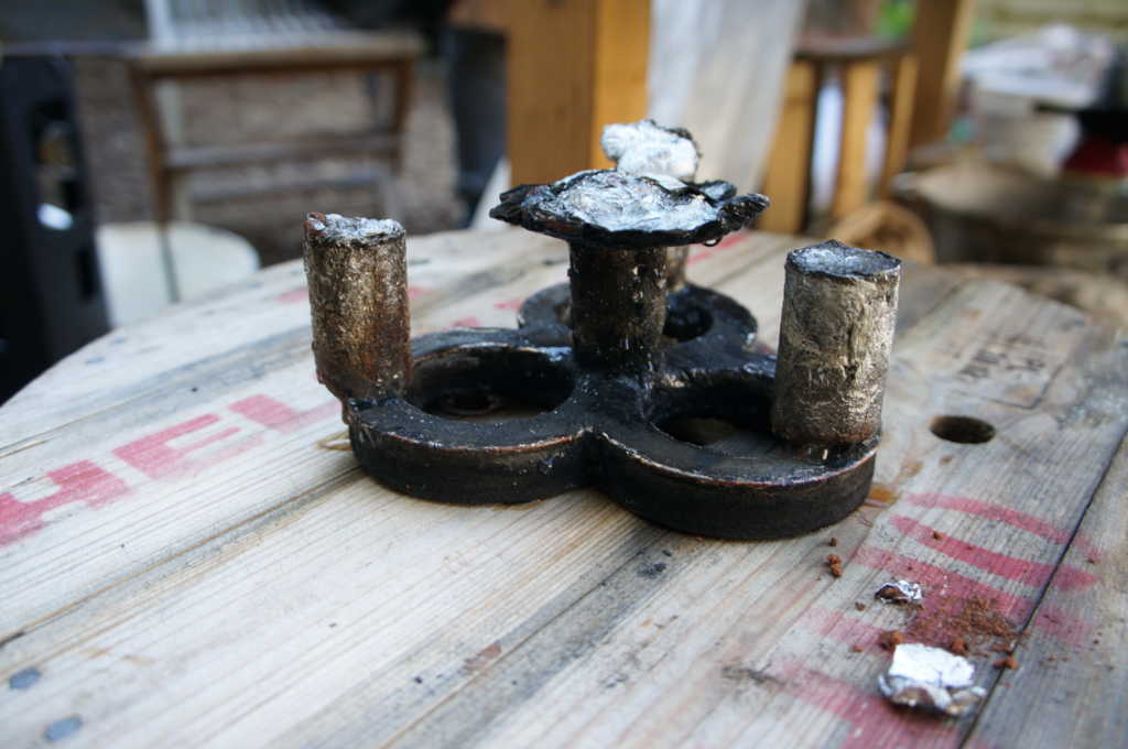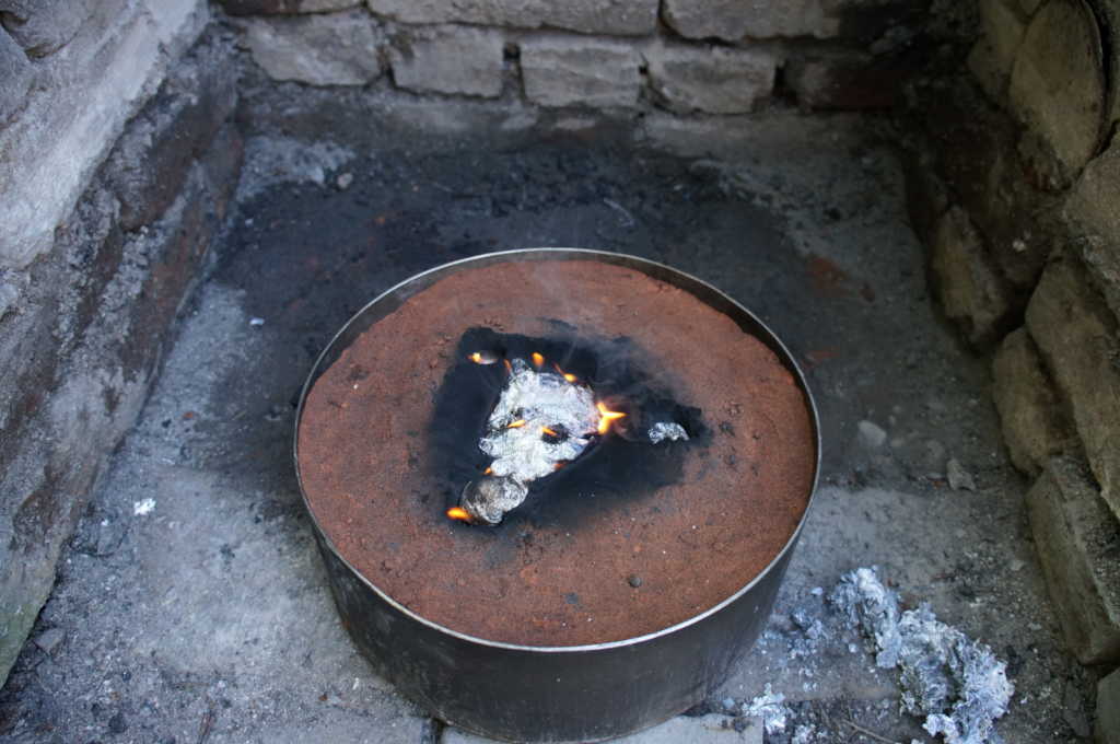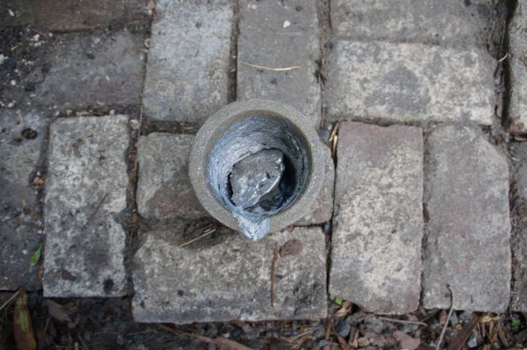 Then you can very carefully pour the aluminium into the casting channel. This can cause small fires as the material that is used to make the mould burns.
