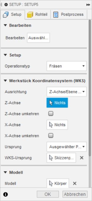 Now we have a new menu bar similar to the other I start on the left and work my way through the steps. First we create a setup. Then we set up our coordinate system Z axis/level & 6 X axis. Below that I choose the model I have created. And finally I choose my holding materials so that I don't mill into them later.