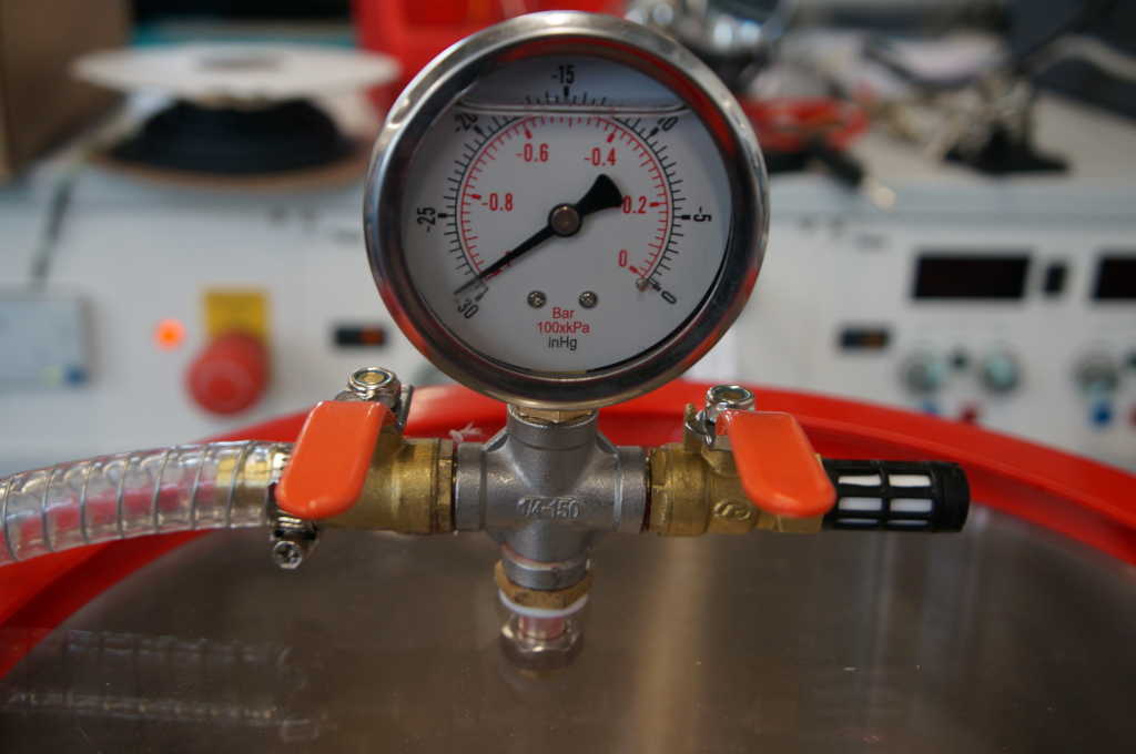 To remove the air from the silicone we use a rubber chamber and a vacuum pump.