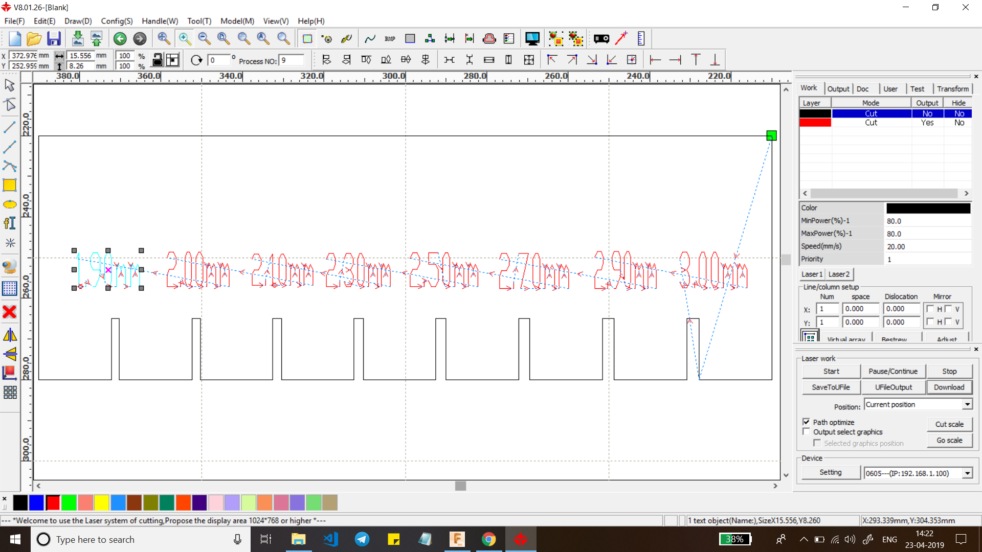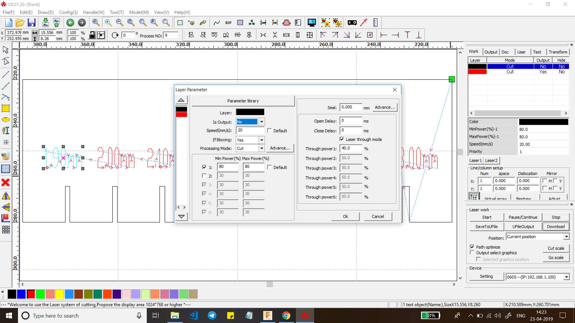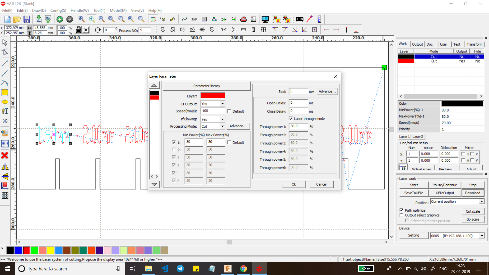 First we started with the raster tests, here we have to set the following parameters to cut the “____” thick stock of cardboard