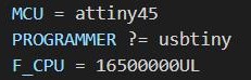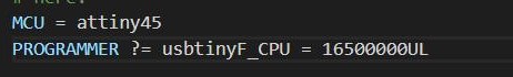 avr-gcc -mmcu=attiny45 -Wall -DF_CPU=16500000UL -I. -funsigned-char -funsigned-bitfields -fpack-struct -fshort-enums -Os -Iusbdrv -c main.c -o main.o