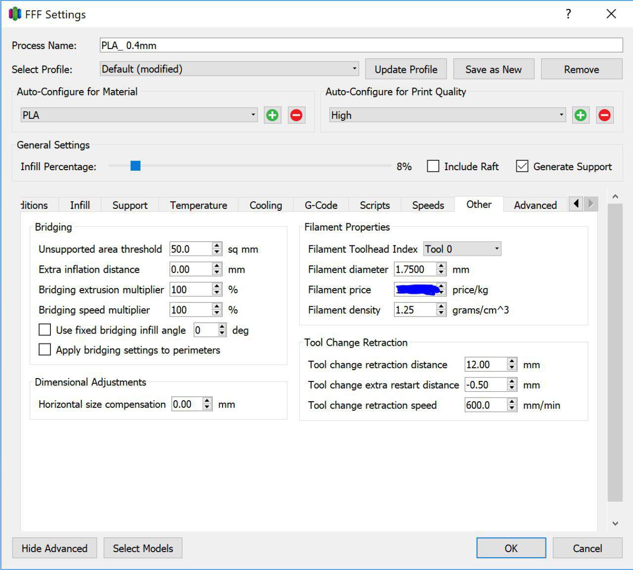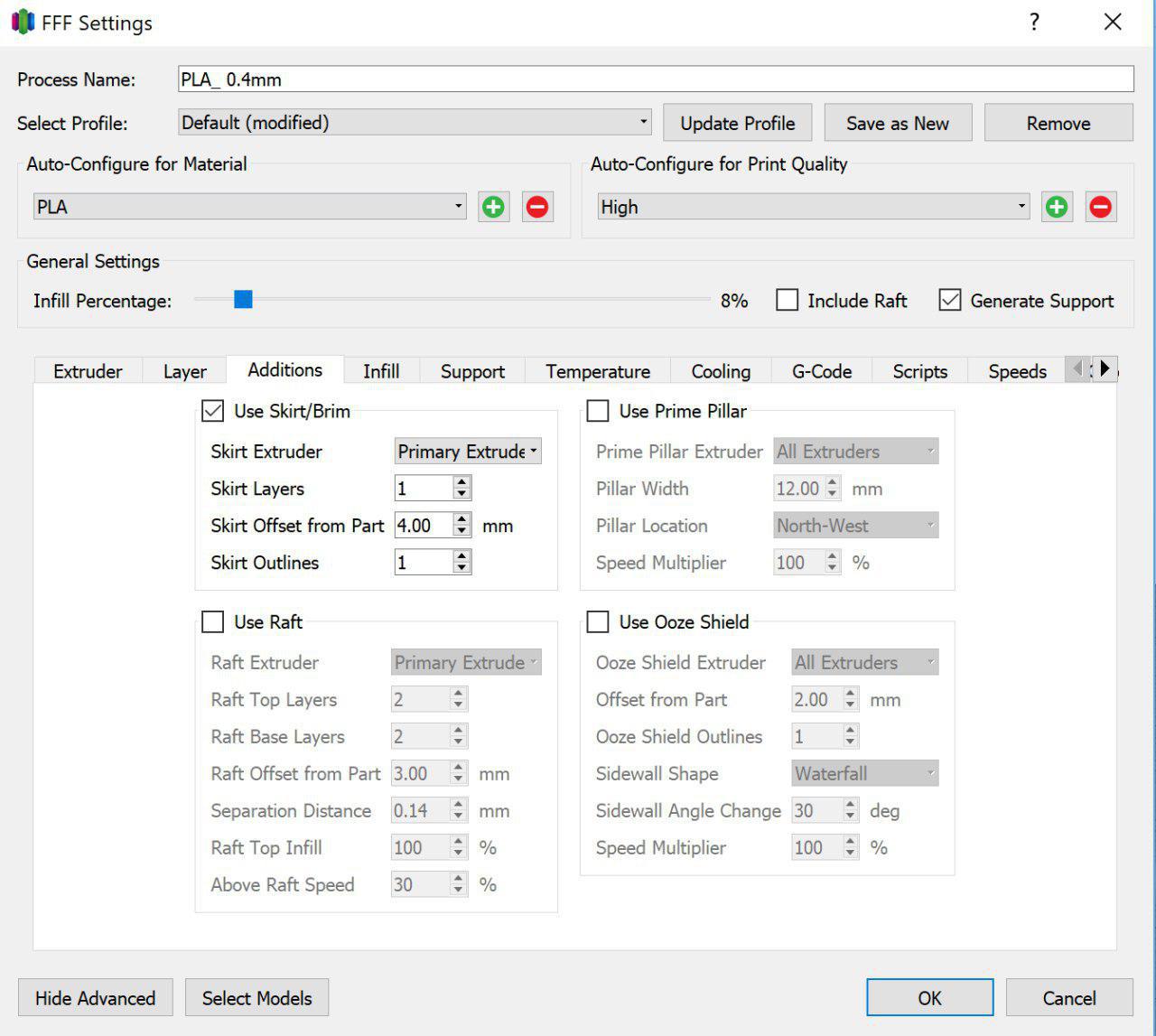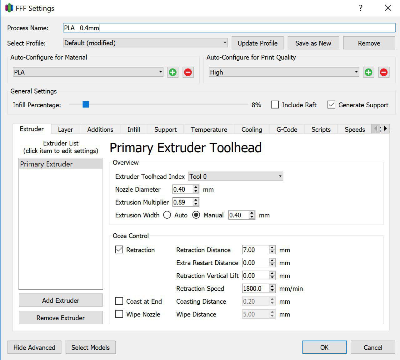 * Nozzle Diameter: 0.4mm * Nozzle Temperature: 200~210C * Extruder Multiplier:0.89 * retraction * skirt/brim
