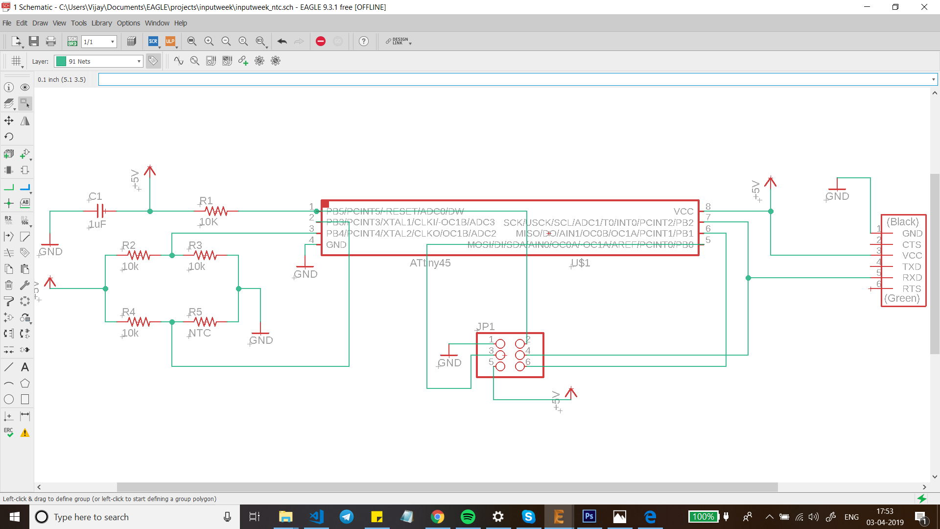 The circuit has an ATTiny 45, 23Pin Header, and Ftdi pin header and one resistor I am using a thermister for which one has to use a circuit is known as Bridge circuit which is used to measure an unknown electrical resistance by balancing two legs of a bridge circuit, one leg of which includes the unknown component. In this circuit we are using wheatstone bridge*.