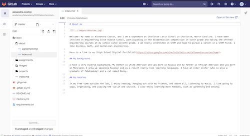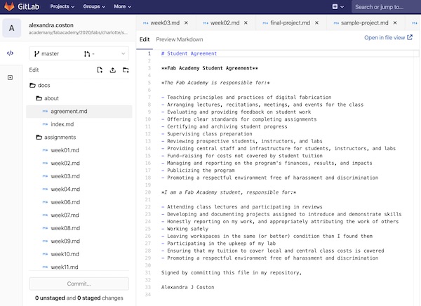 Welcome! Today I began my FabAcademy 2020 journey. The first step was learning how to use and navigate GitLab. After setting up my account, I completed the Student Agreement. Because I am a novice at GitLab, I was advised by a recent graduate of FabAcademy, Will Knight, to find a Markdown Cheat Sheet that I can use to help me document.