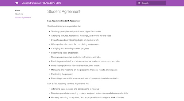 As far as documentation goes, I was advised by past graduates to create a Google Doc and to write everything there. Google Docs has autocorrect and it will also be an easier way for me to keep up with my documentation as I have the app downloaded on all my devices. I read the FabCharter and signed the Student Agreement in my About Me page.