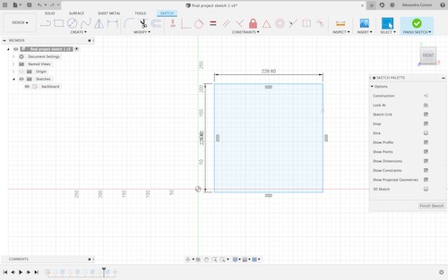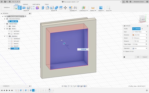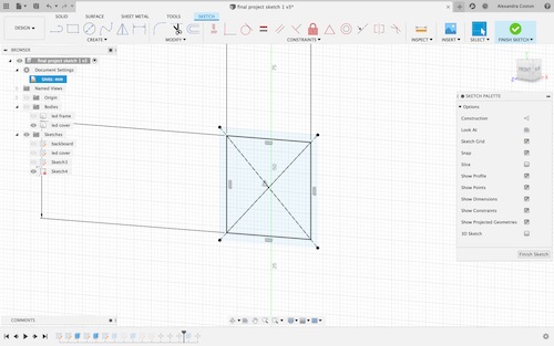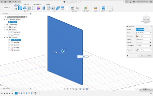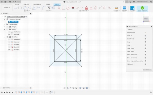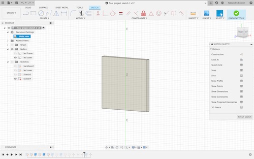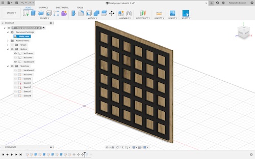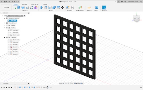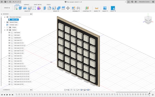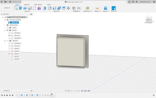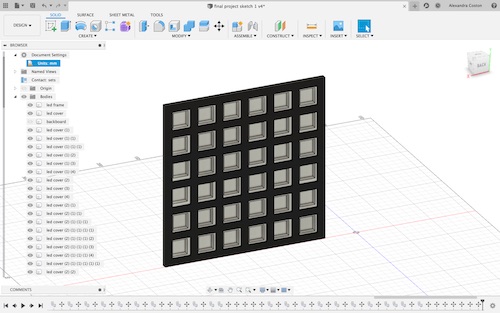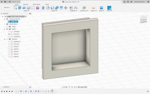 After I felt comfortable sketching on Fusion and making objects 3D, I went ahead and started modeling my final project. The three parts I needed to make were the backboard where the Neopixels would be attached, the frame for the Neopixel strips, and the individual LED covers so the mirror would have a pixelated image effect. I created separate sketches for each piece, which is basically making different layers for each part. This allowed me to separate the bodies.