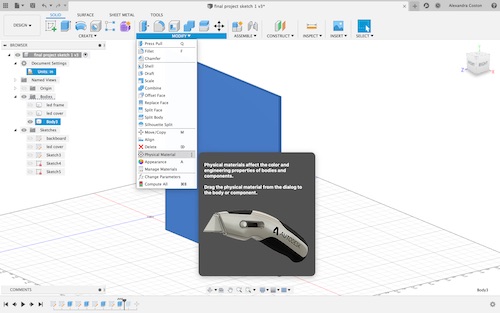 I made the piece black using the physcial appearance tool because I will spraypaint it. I then stacked the two bodies together.