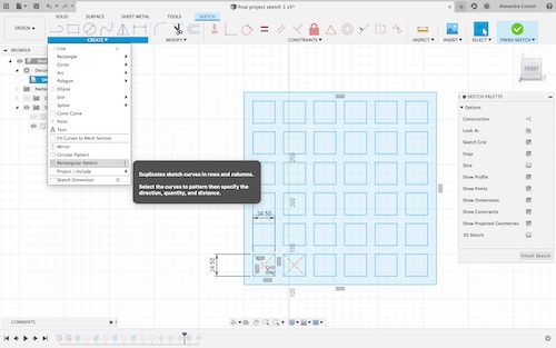 Next, I made a square and made numerous copies of it using the “rectangular pattern” tool so I would have a grid. I then traced a square around it and selected the inside portion to extrude using ‘q’.