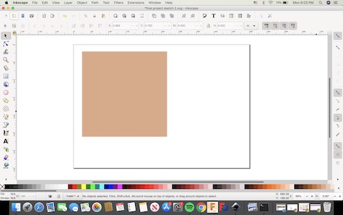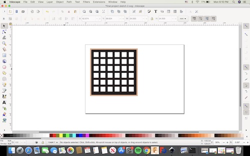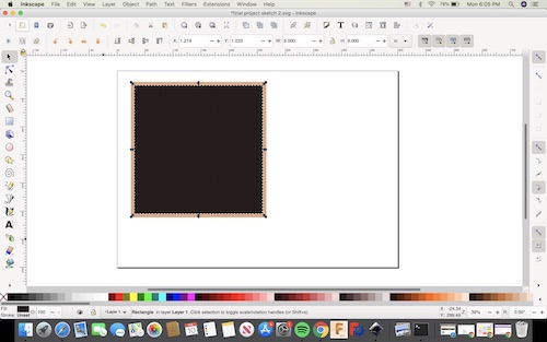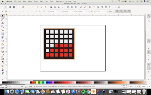 I downloaded Inkscape on my laptop to start modeling my project in 2D. It was pretty simple to navigate and use. I drew a square and used the color spectrum at the bottom to make it’s fill brown. I changed its dimensions to be 9.5in by 9.5in. This would be the plywood backboard. I then drew a 9in by 9in black square to be the Neopixel strip frame. Next I copied and pasted small squares with white fill to show the holes in the frame. Finally, I changed the fill of the squares to be 7.5% gray (for the unlit Neopixels) and red for the Neopixels that were outputting whatever image or shape was seen in the input.