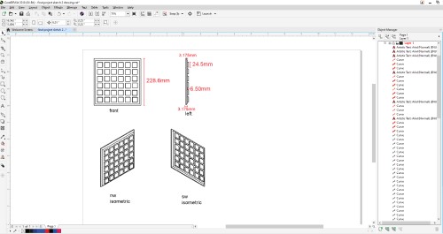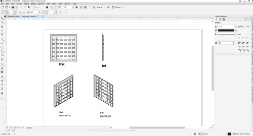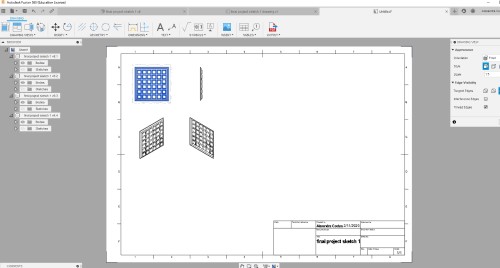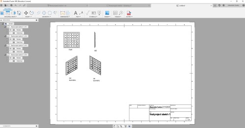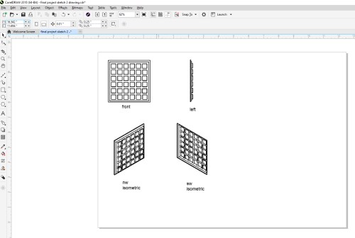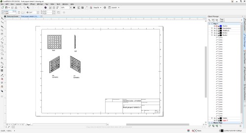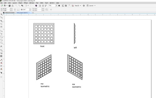 Because I designed my 3D model in Fusion 360 first, I decided I wanted to try and export it as a sketch to Corel so I could edit it. In Fusion, I clicked on “DESIGN” in the top left corner, then hit “DRAWING”, then “From Design.” This generated a drawing of my 3D design that I could view in different views. The default view was the front-facing view. I inserted several others by clicking on the original view and selecting “edit base view,” which produced a menu on the right side that allowed me to change the view. The different views include top, front, home, bottom, left, right, back, SW isometric, SE isometric, NE isometric, and NW isometric. I chose to do four views: front, left, SE isomentric, and NW isometric. I used the text box tool to label each view.