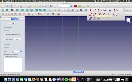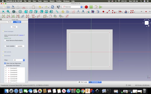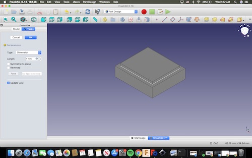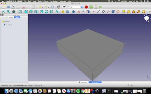 On the left side in “Tasks” is the option to create a body. I clicked this, clicked my rectangle, and pressed “Pad” on the top toolbar. This tool extrudes the sketch, and I was able to change how much it extruded on the left side. I extruded it 5mm.