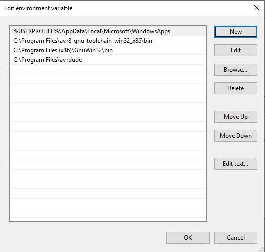 C:\Program Files (x86)\GnuWin32\binandC:\Program Files\avrdudethen click OK