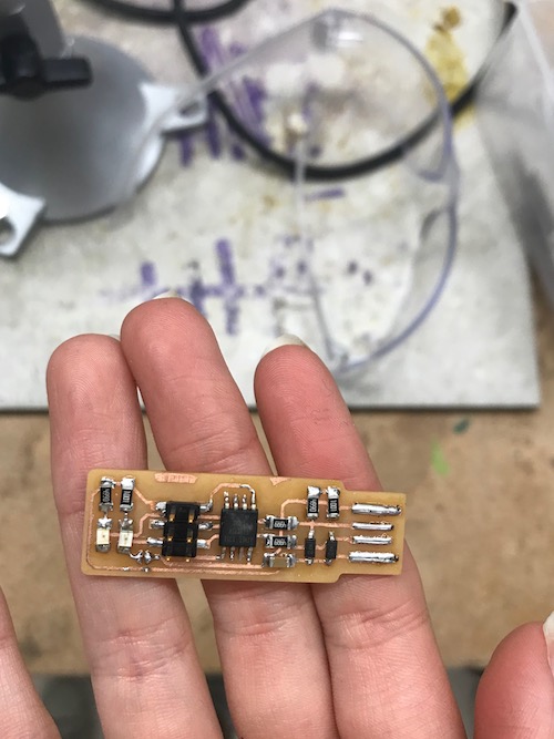 Following this was surface-mount soldering. I soldered the components starting from the inside and working outwards. I placed solder down, put down the piece, then reheated the solder to keep it in place. I then soldered the other pins or sides. Using this technique, I first soldered the ATtiny45 chip.