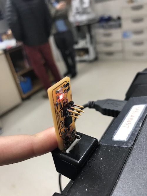 I plugged in my programmer into a USB port to see if it worked. The red LED lit up, indicating that my soldering was sufficient and my programmer was ready to be programmed.
