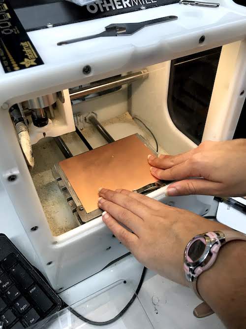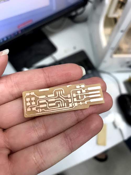 The group assignment for this week was to characterize the design rules for the PCB production process: document feeds, speeds, plunge rate, depth of cut (traces and outline) and tooling. All of my peers played different roles in completing this assignment, though we did work collaboratively. To read about our process, you can visit my team’s group page here. My individual contributions included defining the terms to describe PCB production (e.g. plunge rate), exploring Fab Mods and Modules in order to generate a Gcode file to send to the milling machine, and milling the traces and outline of the ruler itself. Because our initial trace depth was not deep enough to penetrate the copper on the PCB, we had to do a bit of trial and error editing the Z axis value before the traces were milled out properly. I helped with this process of confirming the position of the bed and thickness of the material in order to correctly mill the traces.