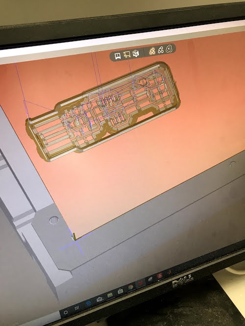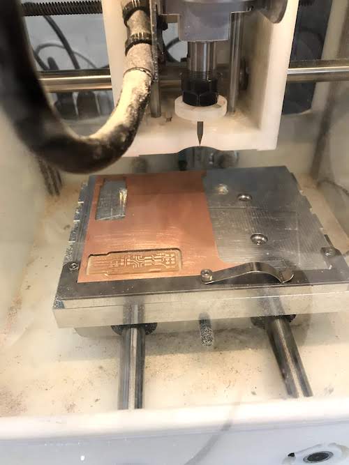 I then needed to locate the bed and the material to set the z-axis accordingly. I used a PCB Engraving Bit 0.003”, which I learned how to carefully insert into the machine. Once the bit in the machine is changed, the plate is located by having the bit slowly drop and touch the bed. Then, the machine finds the material thickness by slowly dropping the bit, touching the material while the clip is on it, and sensing the electricity conducted. I did this by selecting BitBreaker -> Probe Material Thickness. Once the origin was reset and the dimensions were confirmed, I began milling the traces of the programmer. I had to repeat this process–changing the bit, re-homing the axes–so I could cut the outside of the programmer. Once it was finished, I was able to use a scraper to pry the PCB off the plate.
