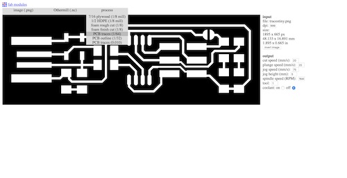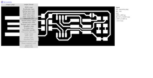 The given tutorial provided the traces and ]outline of the programmer as PNG’s. Thus, the first step was to take these images and create a Gcode file in order to generate the toolpaths that the milling machine could read and use. For this process, I used Fab Modules. I was prompted with the opening page: