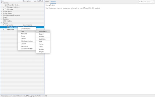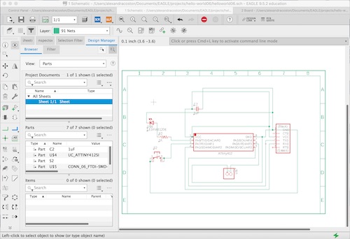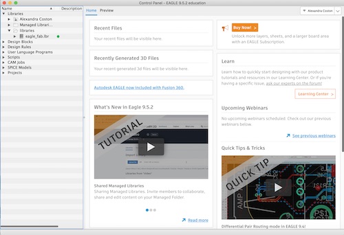The first step was downloading Autodesk Eagle with my student license. I had never used Eagle before, so I started by watching their two part webinar here and here in order to learn the basics of how to use Eagle. While I probably should’ve made my circuit on another platform, Tinkercad for example, before beginning my actual design on Eagle, I jumped straight into creating my schematic. I downloaded the libraries I needed, a library for Eagle that Neil provided, fab.lbr, the Sparkfun libraries, and a library provided by my teachers that contained all the new components I would need, fab_new.lbr. Once the libraries were downloaded, I moved them into my libraries folder so that they would show up in Eagle.