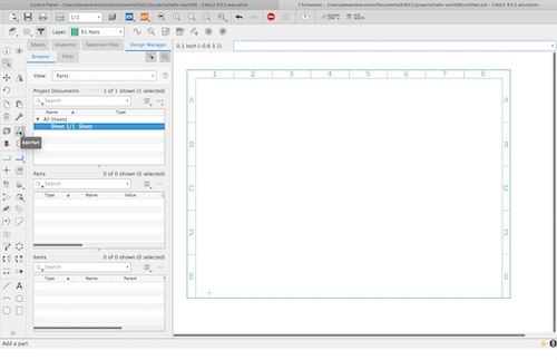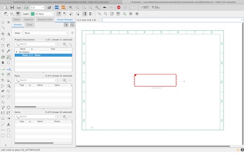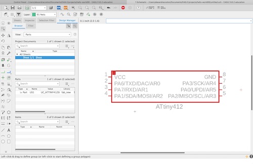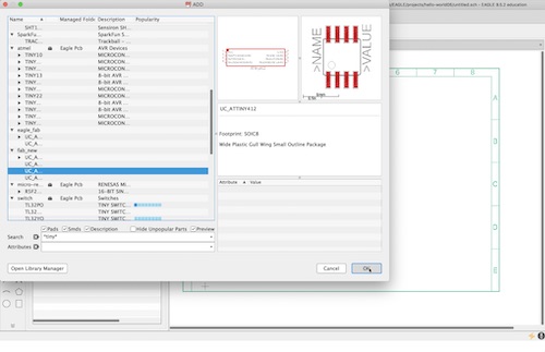 I decided to gather all my components first. I decided to create the ATtiny412 board, as my lab had just acquired the chips and they were supposed to be better than the ATtiny45 chips we used for our programmers. As such, I used Neil’s example board to create mine. I additionally needed to include a button and LED onto my board, so I added these components. The trickiest part of finding the components was not knowing what they were named, so I had to scroll through a bit to find what I needed. In order to insert a part, I selected ‘Add Part’ on the left toolbar.