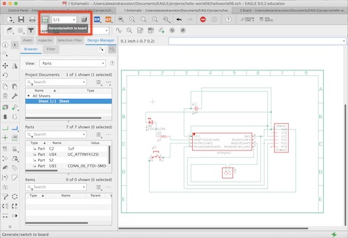 Once my schematic was finished, I clicked ‘Generate/switch to board’ to generate my board.
