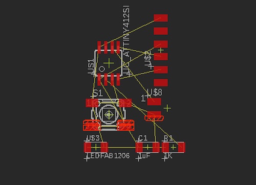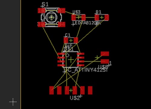 The remaining components I needed were: a capacitor, an LED, a resistor, a button, a 6x1 pin header, and a 2x1 pin header. I assigned the capacitor and resistor their respective values by clicking on the component and pressing ‘Value’. Once I had all the parts I needed, I moved them around and used the ‘Net’ command to connect them.