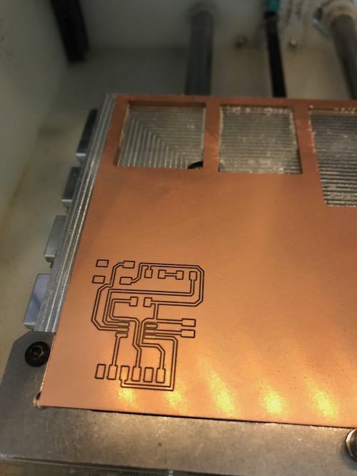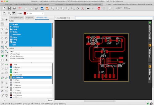 My board was ready to be milled! I saved the Eagle file, which automatically located itself into my project folder inside an Eagle folder. I imported the hello-world06.brd file into Bantam Tools. I used a 1/64” bit to engrave the traces and a 1/32” bit to cut the outline.