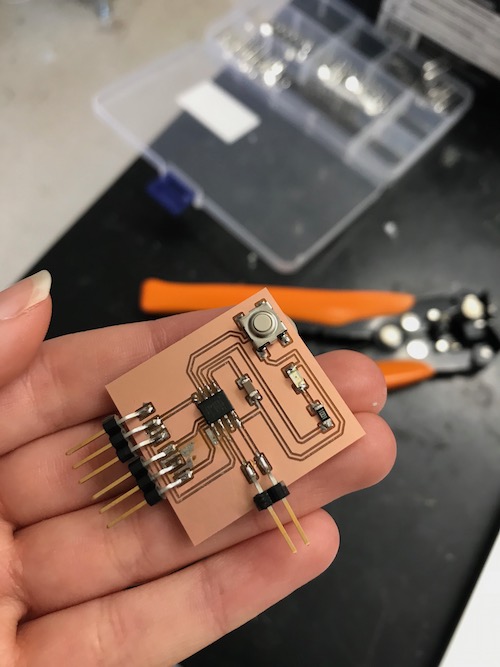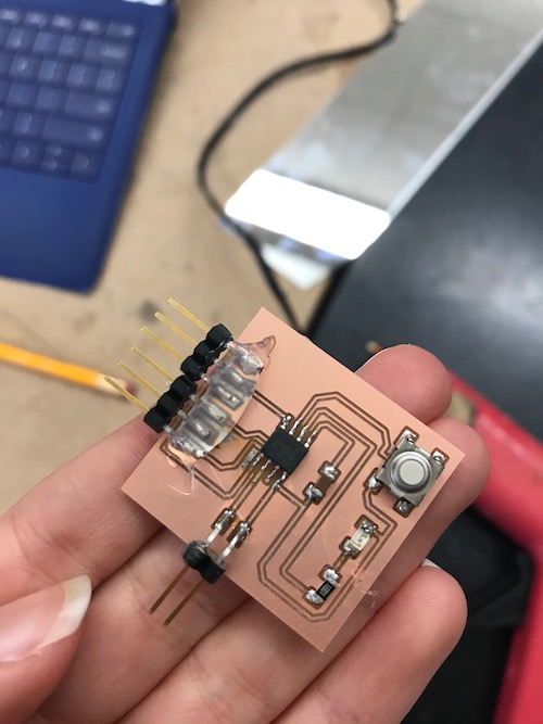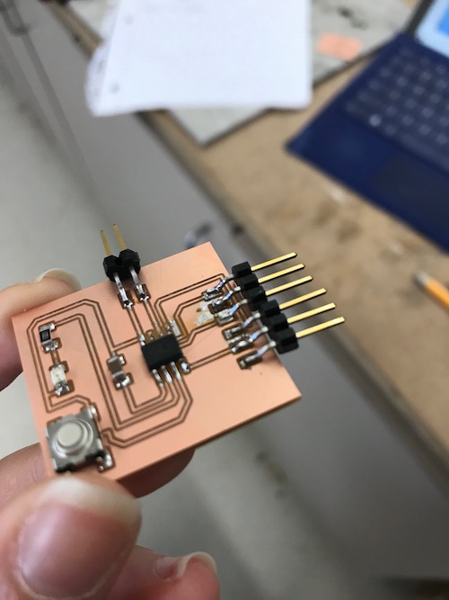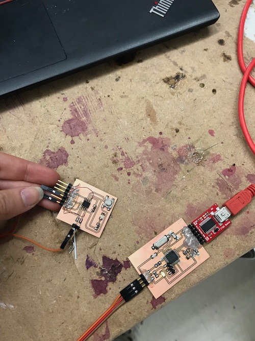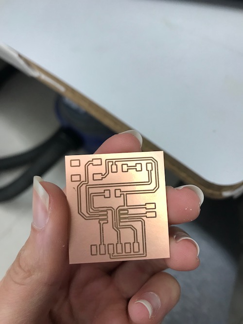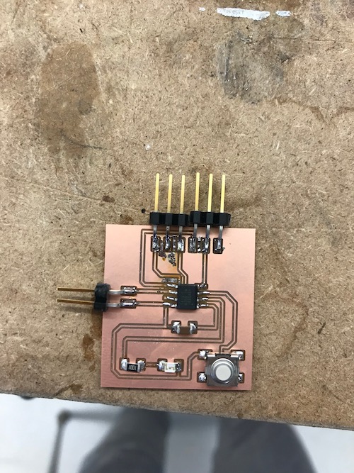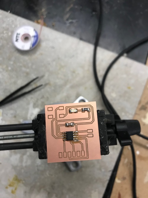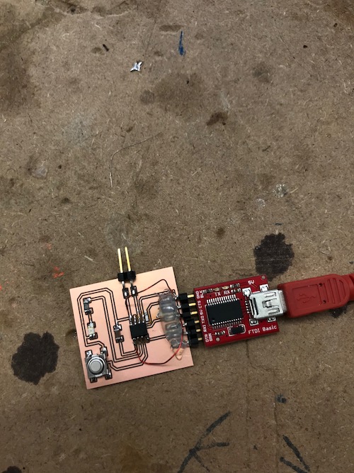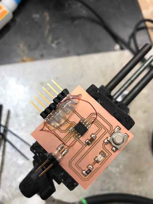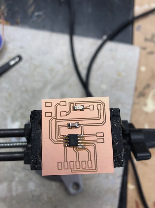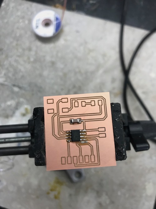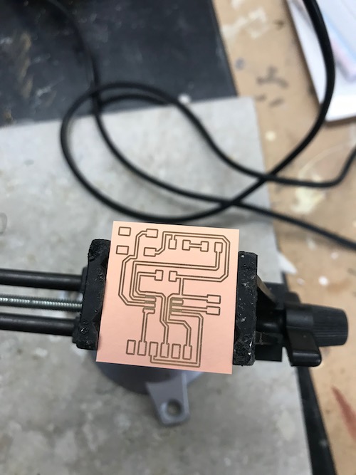 Once my board was finished and working, I went back and made the programmer that my instructor had let me borrow to program my board. The ATtiny45 programmers that we had previously made were not suitable to program these new boards. I used my instructor’s pre-made file and put it into Bantam to mill.