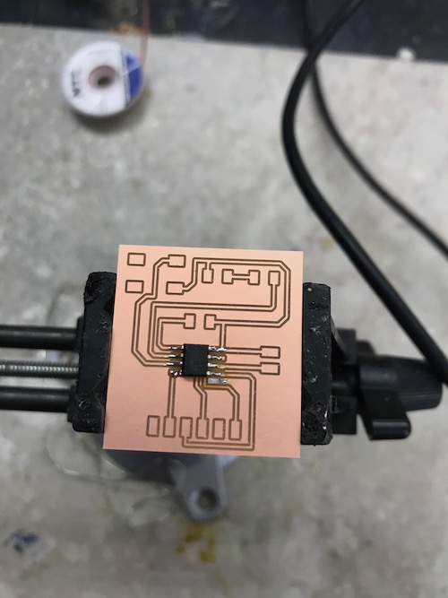 I then put some solder on each edge so it would make soldering to the board easier. Carefully, I solder one end of each wire to the pins and the other end to the chip.