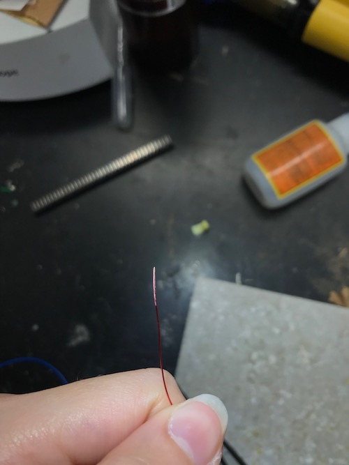 This solution worked when I uploaded some simple Blink code to my board. Unfortunately, when I went to upload Neil’s Hello-World code, my board did not work. I checked the connections with a multimeter, and found that my pins were not working anymore. Instead of scrapping the whole board and creating a new one because of two pins, one of my instructors, Mr. Rudolph, suggested using some wire to connect the pins that were not working, VCC and GND, to the corresponding spots on the ATtiny chip. I took two small pieces of wire and scraped off the coating on the edges using sandpaper to reveal the copper underneath.