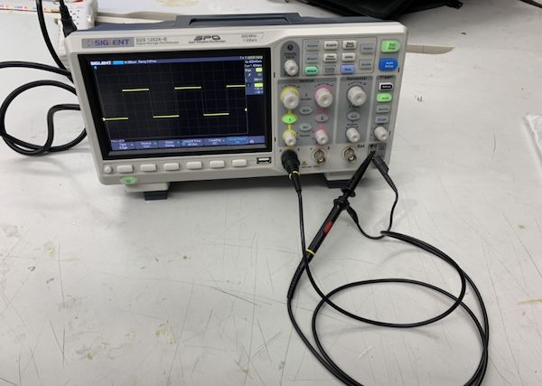 The group assignment for this week was to use the test equipment in our lab to observe the operation of a microcontroller circuit board. My peers and I split up into groups to learn how to use the oscilloscopes since our lab had several. We first watched a Sparkfun video to learn what an oscilloscope was and how to use it. The oscilloscope we used was the [SDS100X-E Series Super Phosphor Oscilloscope] (https://siglentna.com/digital-oscilloscopes/sds1000x-e-series-super-phosphor-oscilloscopes/). We followed the steps in the video to set it up. This included: - turning on channel 1 and turning off channel 2 - turning DC to Coupling - making sure the probe was on the 10x setting - under the trigger menu, setting Type -> Edge, Source -> Channel 1, and Slope -> Rising