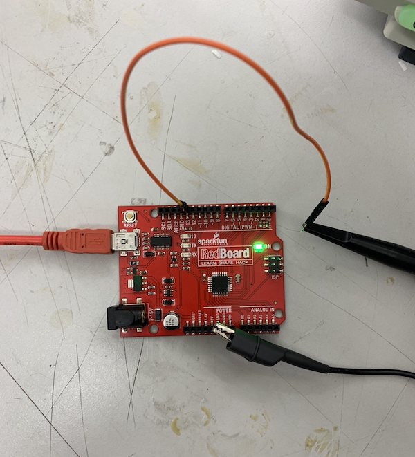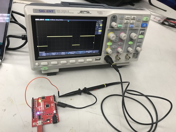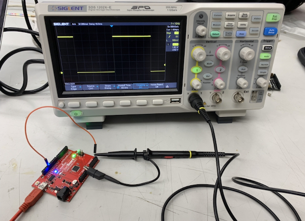 We uploaded simple Blink code to an Arduino and then connected it to the oscilloscope. The probe tip went to pin 13 and the alligator clip went to GND. We then clicked ‘Roll’ and watched the oscilloscope’s display.