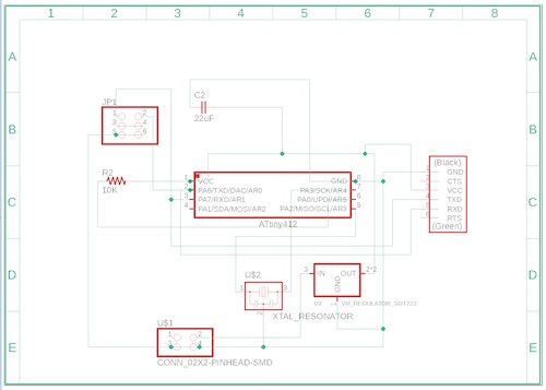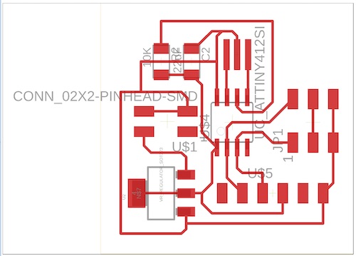 I decided I wanted my output to be a servo motor. I had worked with servos very briefly in the past, but never in depth. Using Neil’s board as a guide, I altered my input board schematic to include the components I would need for my new board. This included adding a 5V regulator, a 20mhz resonator, and some pin headers to connect the servo. Here is what my final schematic and board files looked like: