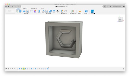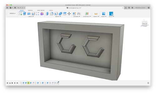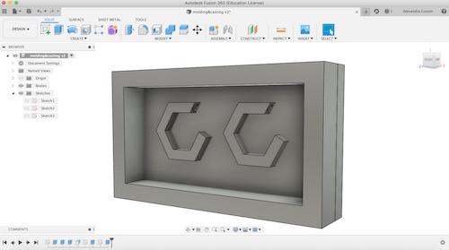 Instead of designing something for my final project like I probably should’ve, I decided to create a mold & cast for a pair of earrings. I like fashion and this was something I’d always wanted to try, so now was the time to learn I suppose. I created my design in Fusion360, making a rectangle and the shape of the earrings, and putting a frame around it so the cast could be made.