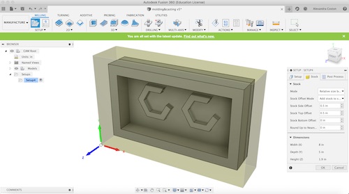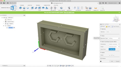 First, I switched from Design mode to Manufacture so that I could create the toolpaths. I then made a new Setup. I put the Stock Setup in the bottom left corner, as that is where the origin is the the Othermills. I made sure the X, Y, and Z axes were correctly oriented as well. When creating my stock size, as I was not in the lab, I added 0.5in to the side and 0.5 in to the top and planned to change these dimensions in the future.