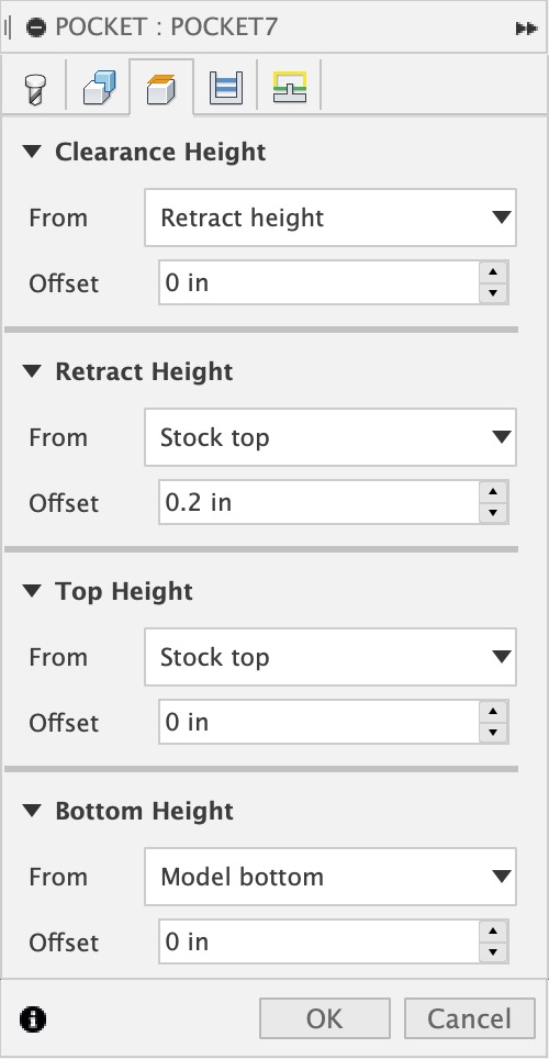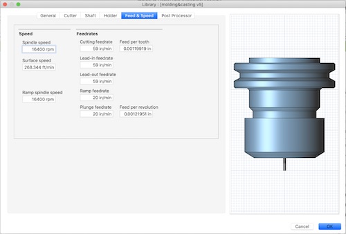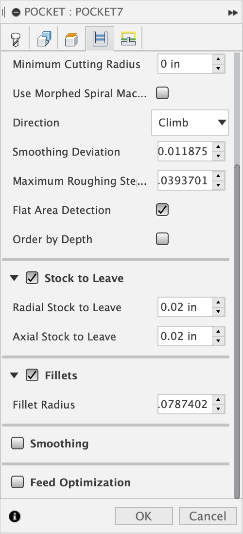 When it came to the Feed & Speed tab, I referred to Bantam Tools’s Feeds and Speeds sheet that we had also used in week 4. I used the settings for Wax under the Advanced Section.