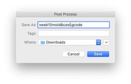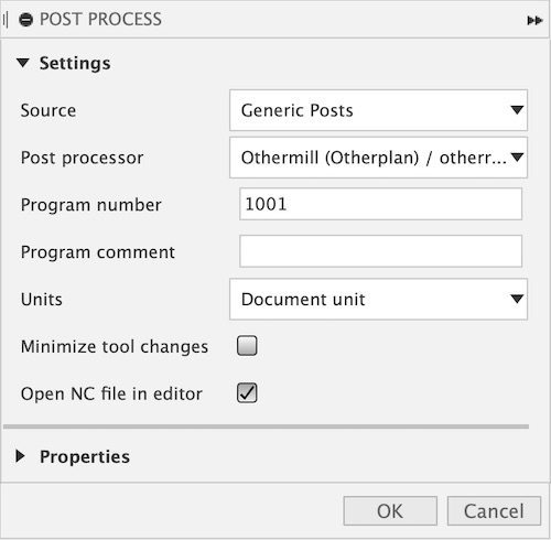 I then went to Post Process to save my toolpath. I changed the Post Processor to Othermill.