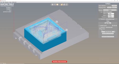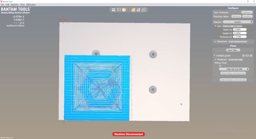 The next step was milling. I decided I wanted to mill my mold out of wax. The only thing was, our lab only had 3x3 in blocks of wax. This forced me to scale down my design and delete one of the earrings. I would just cast it twice, which was fine. After editing my design and redoing the toolpaths in accordance with my material (3x3x1.31 in), I downloaded the new gcode and opened it in Bantam Tools. I then created the size of my generic material and imported my toolpaths. I selected the 1/8in Flat End Mill as the tool.